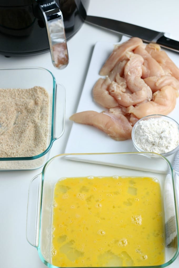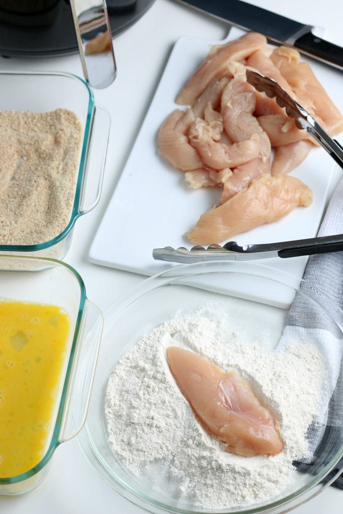 - Dip a chicken tender in flour, eggs, and then in breadcrumbs mixture. Be sure to coat evenly.