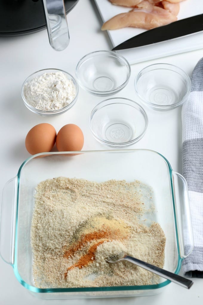 - Add bread crumbs and seasonings to shallow bowl and combine well½ cup breadcrumbs, ½ teaspoon garlic powder, ¼ teaspoon black pepper, ½ teaspoon seasoned salt, ¼ cup Panko crumbs **see notes