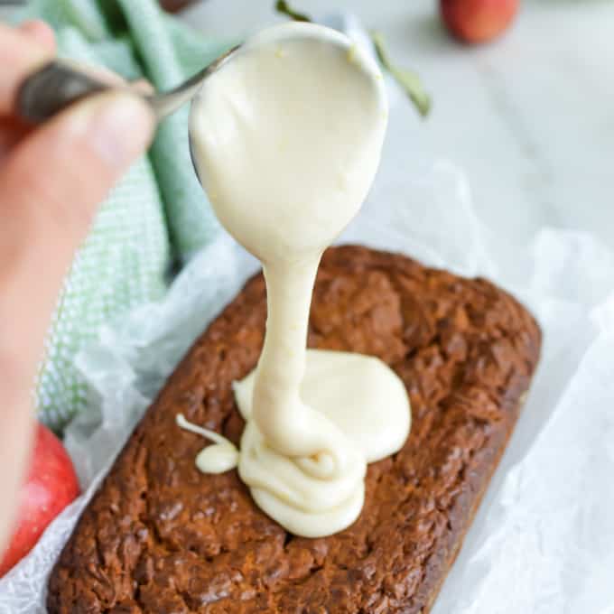 Unlike our apple streusel bread, which has a brown sugar and oat, topping, this recipe includes a thick lemon glaze which you can omit if you prefer.