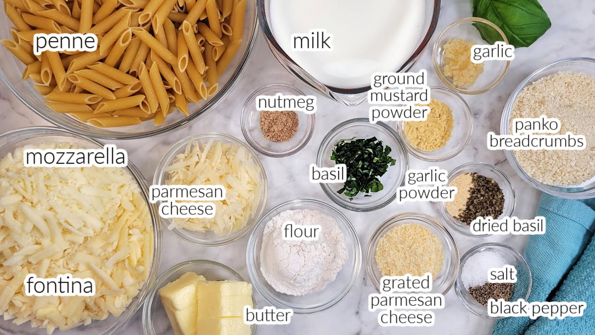 This creamy mac and cheese is made with three cheeses, seasoned with garlic and basil, then baked with crunchy breadcrumbs on top.
