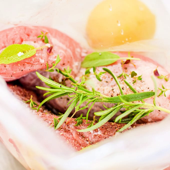 - Combine the marinade ingredients together in an airtight container or ziplock bag, add the pork tenderloins and fully coat the meat. Chill in the fridge for at least 1 hour or up to 24 hours.2 pounds of pork tenderloin, ¼ cup lemon juice, ¼ cup avocado or olive oil, Fresh herbs, ½ teaspoon salt, ½ teaspoon pepper, Red pepper flake