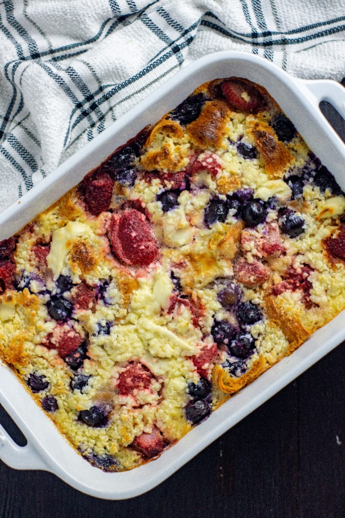 Blueberry Croissant Bake - we've layered tender flaky croissants with a decadent sweetened cream cheese mixture and fresh berries for the ultimate blueberry croissant breakfast bake that's easy to prep ahead of time!