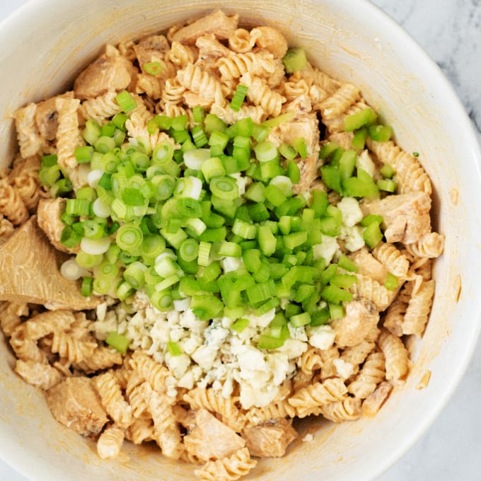 - Fold in cooked pasta, blue cheese, green onions, and celery until well incorporated.