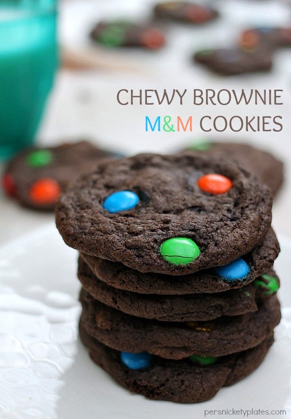 These chewy M&M Brownie Cookies almost have a brownie texture to them! They're filled with chocolate chips and M and M candies, and they're so easy that you don't even need a mixer!