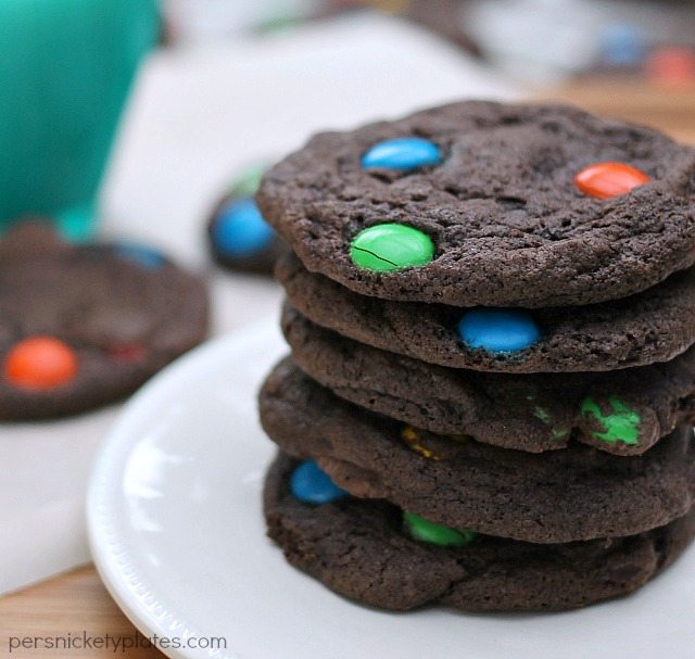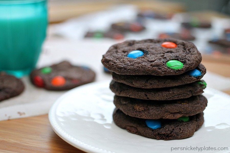 This cookie is rich and full of chocolate and also chewy like a brownie. The bright M&Ms are a fun splash of color. They're included in the batter as well as pressed into the dough after you scoop it so they really show up. It's an optional step, but it makes them look pretty, and there's nothing wrong with a few more M&Ms, right?