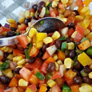 - In a large bowl, combine all of the chopped vegetables and the black beans.3 Roma tomatoes, seeded and diced, 1½ cups sweet corn kernals, ½ cup red bell pepper, ½ cup green bell pepper, ½ cup yellow bell pepper, ⅓ cup red onion, 1 jalapeno pepper, 1 15oz can black beans, ½ cup orange bell pepper