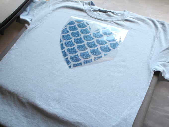 - Next warm up the shirt with the EasyPress 2. Then Place the mermaid scale heart with the glitter/plastic side up on the shirt.