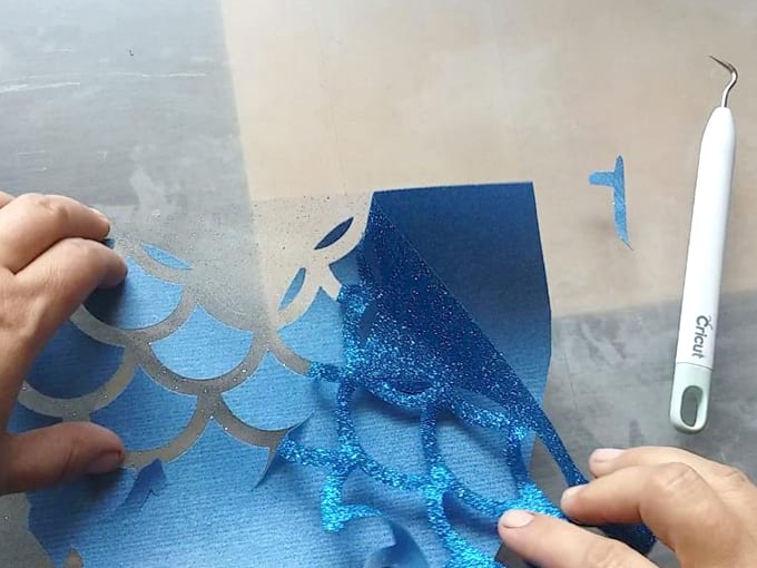 - Repeat the process with the pink glitter iron-on and cut the I and the mermaid silhouette.