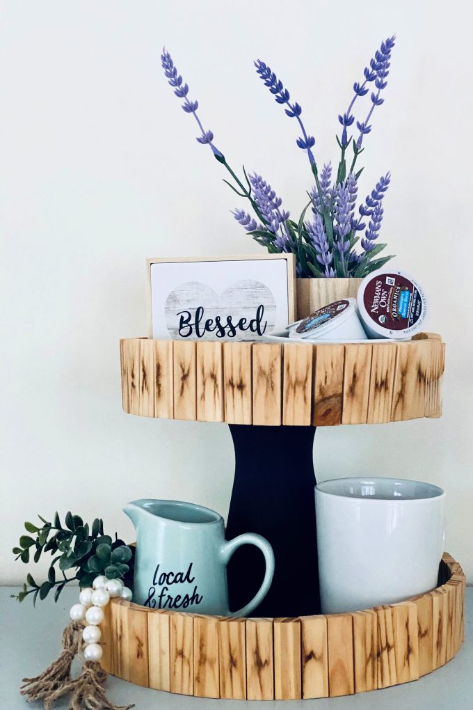 This DIY wood-tiered tray tutorial will show you how to make a really unique farmhouse tray that will add rustic charm to your home using items from the dollar store.