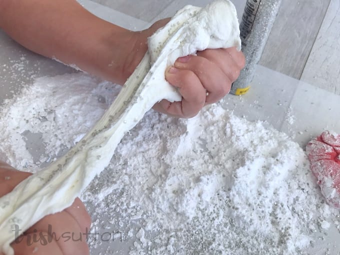 - Finally, when the melted marshmallow is cool to the touch spray a layer of cooking spray on your hands then squish the marshmallow, glittery sprinkles (if using) and powdered sugar together to create easy fluffy slime.Edible Glitter, Cooking Spray