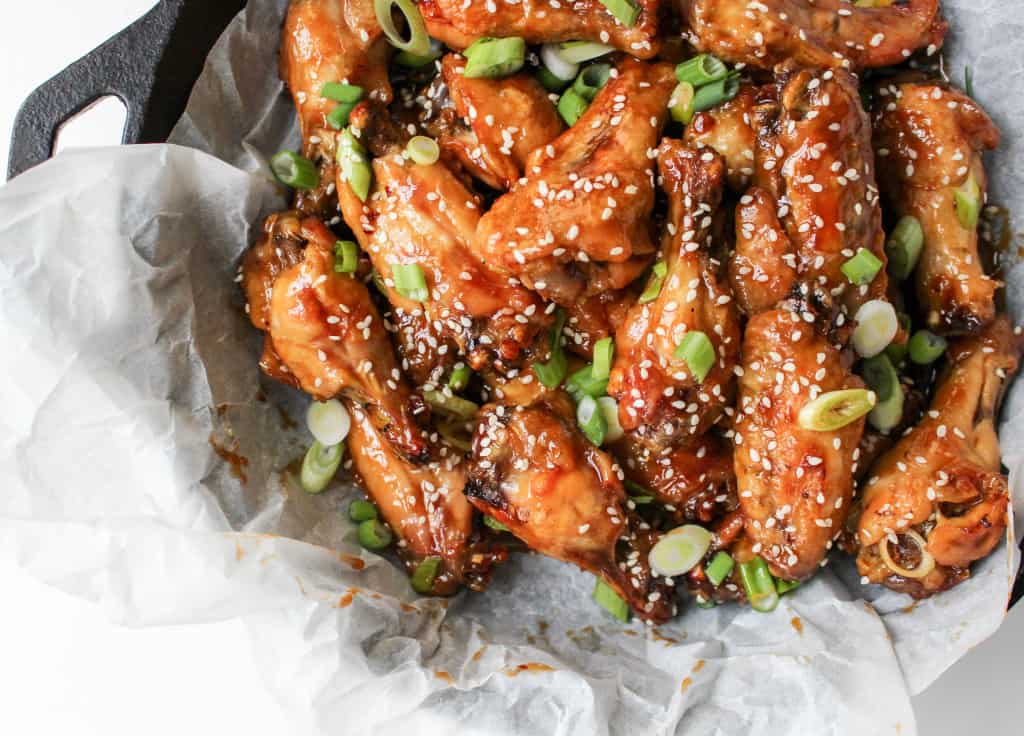 • Top down view of teriyaki chicken wings.