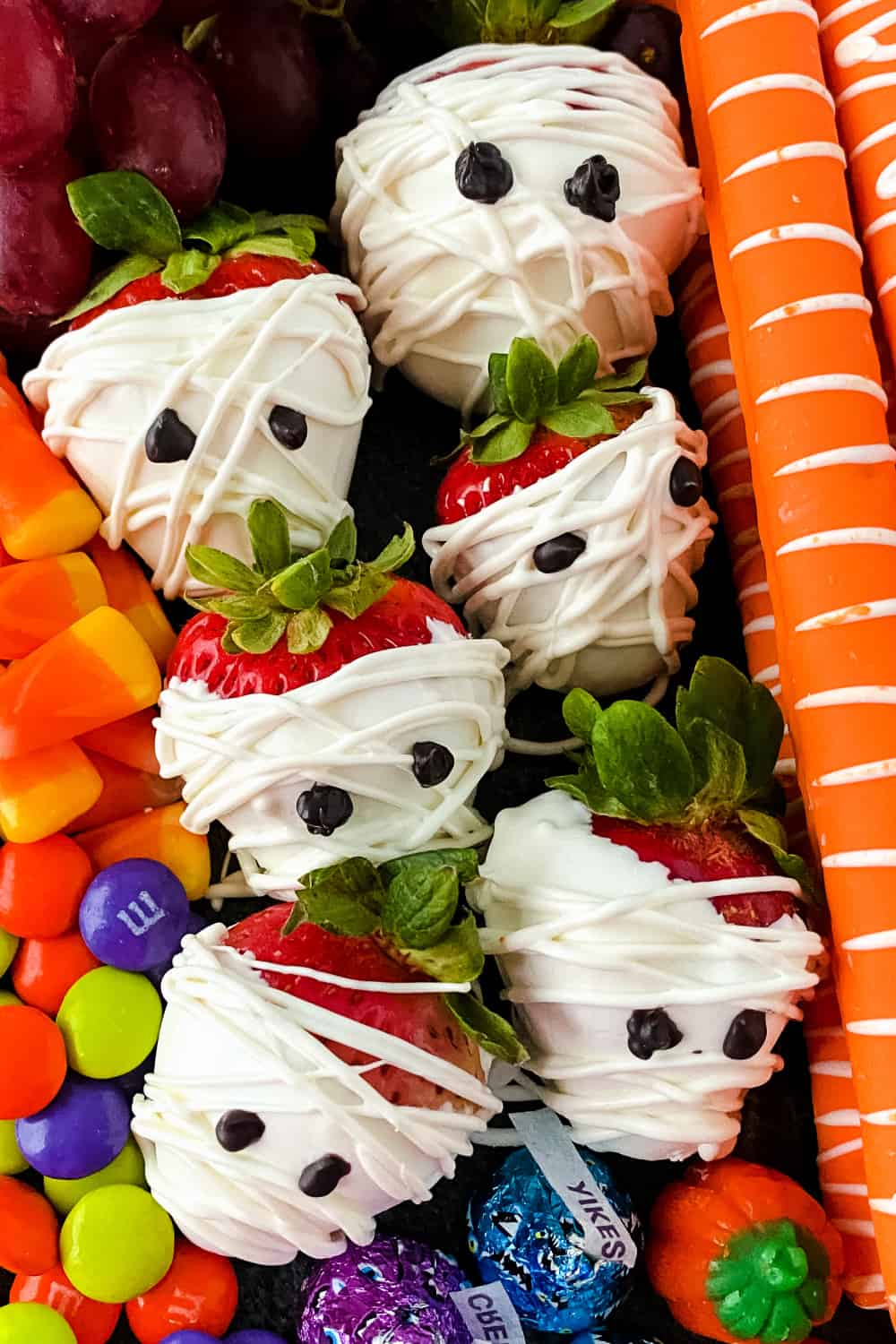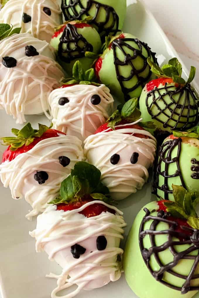 Halloween Chocolate Covered Strawberries dipped in chocolate and decorated as mummies or with spider webs are just about the cutest things! These fun treats are perfect for your next Halloween Party or for making a Halloween Charcuterie Board.