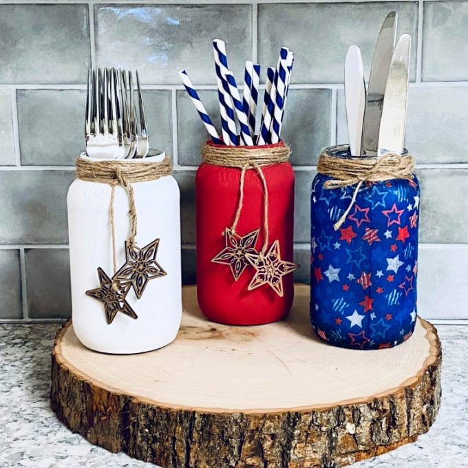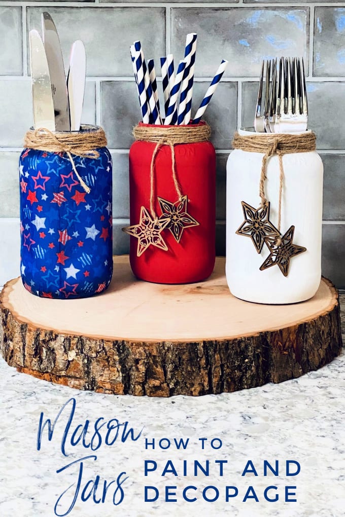 Three painted mason jars in patriotic colors. From right to left - decoupaged fabric on a mason jar holding knives, red painted mason jar with twine and star decor, white painted mason jar with twine and star decor.