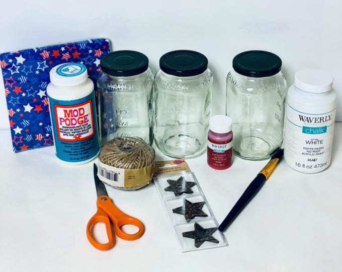 supplies for painting and decoupaging Mason Jars include scissors, Mod Podge and chalk paint.