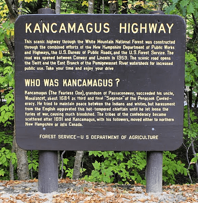 The highway is named after Kancamagus, the Fearless One, the final chief (or sagamore) of the Pennacook people.