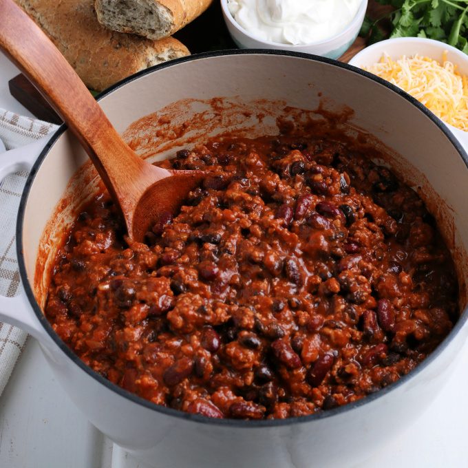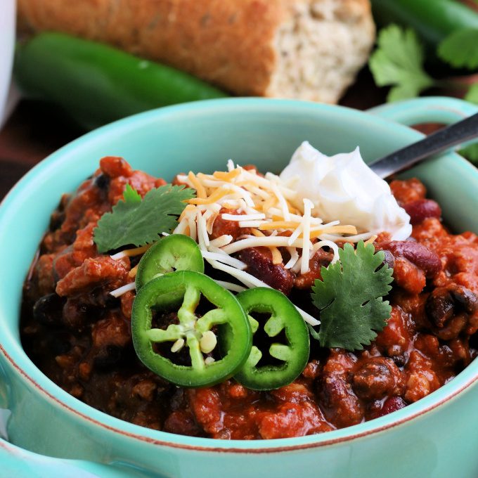 Our easy Turkey Chili is a hearty meal! A bowl of this leftover turkey chili can be enjoyed as a satisfying main dish, served with your favorite toppings such as: