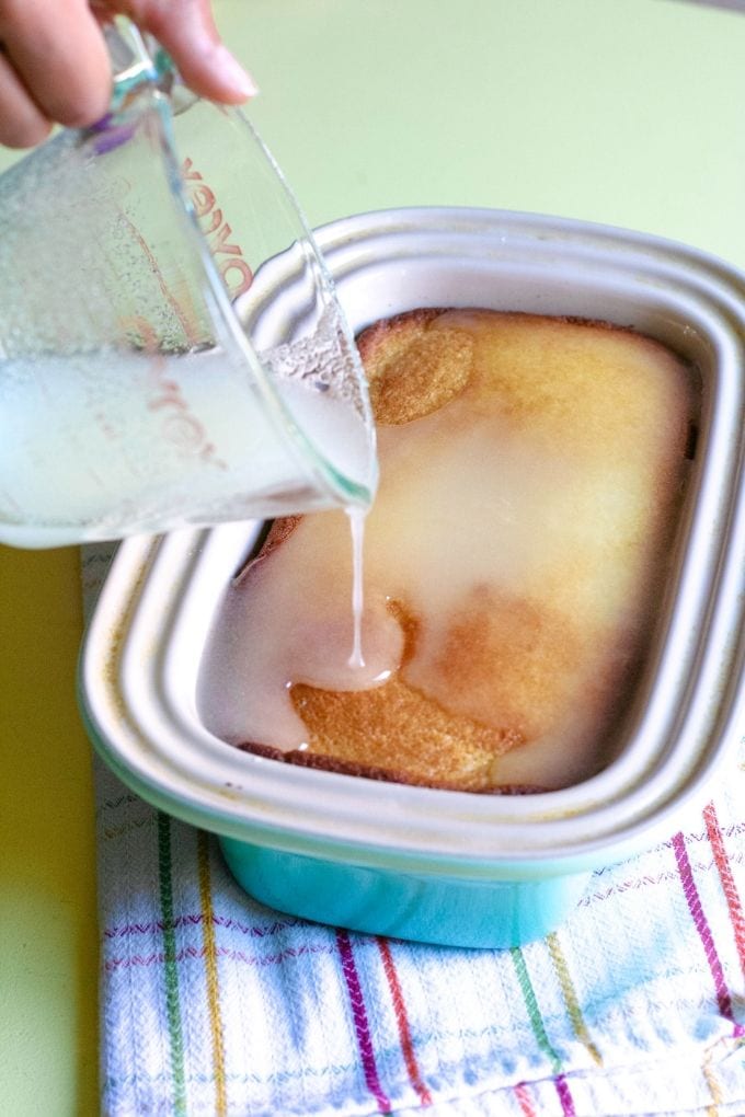 - After the bread has cooled for 15 minutes but is still warm, pour the glaze over the whole bread.