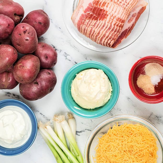 Image contains ingredients for loaded potato salad - red potatoes, bacon, sour cream, spices, cheese, green onions and mayonnaise.