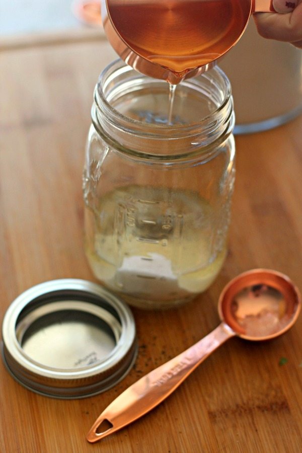 - Add the dressing ingredients to a medium jar. Cover tightly with a lid and then shake well.3 tablespoons honey, ¼ teaspoon salt, ¼ teaspoon pepper, ¼ cup white vinegar, ½ cup canola oil, 1 teaspoon fresh ginger, 1 teaspoon soy sauce