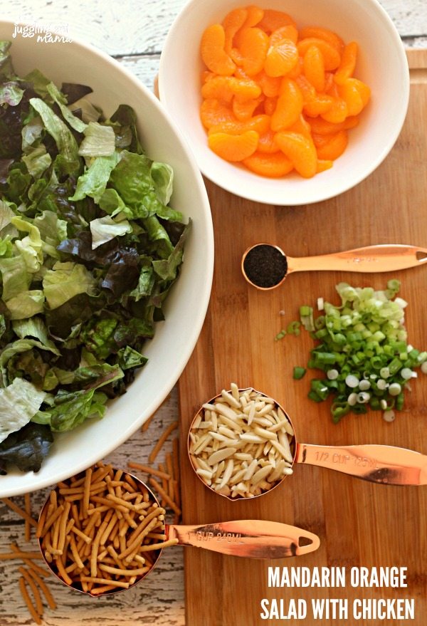 - Top the salad with the chopped green onions, slivered almonds, mandarin oranges, chow mein noodles, poppy seeds, and chicken.4 green onions, ½ cup slivered almonds, 1 can mandarin oranges, 1 cup chow mein noodles, ½ teaspoon poppy seeds, 1-2 cups rotisserie chicken