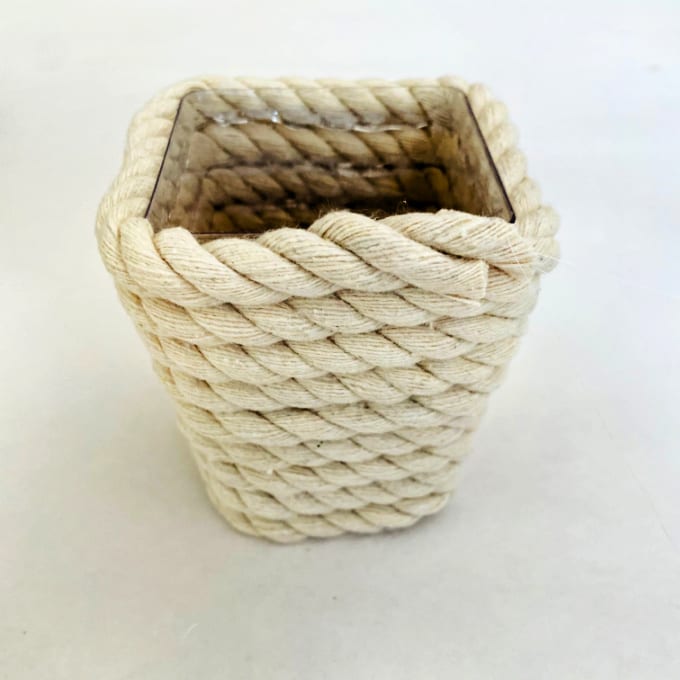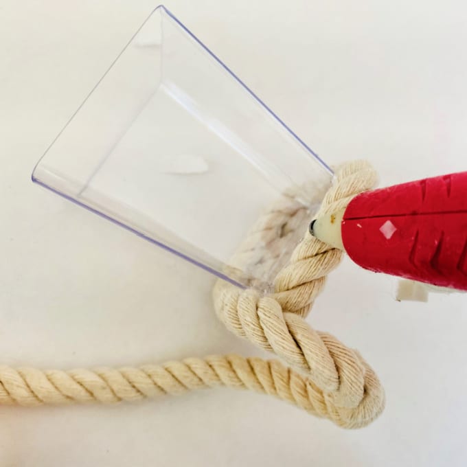 - Start by adding a line of glue around the bottom of the dessert cup and wrap the cotton rope around making sure to press down so that it adheres to the glue.