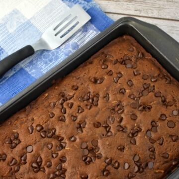 - Pour the batter into the prepared pan and sprinkle the chocolate chips and walnuts on top if you want.½ cup semi-sweet chocolate bits, ½ cup chopped walnuts