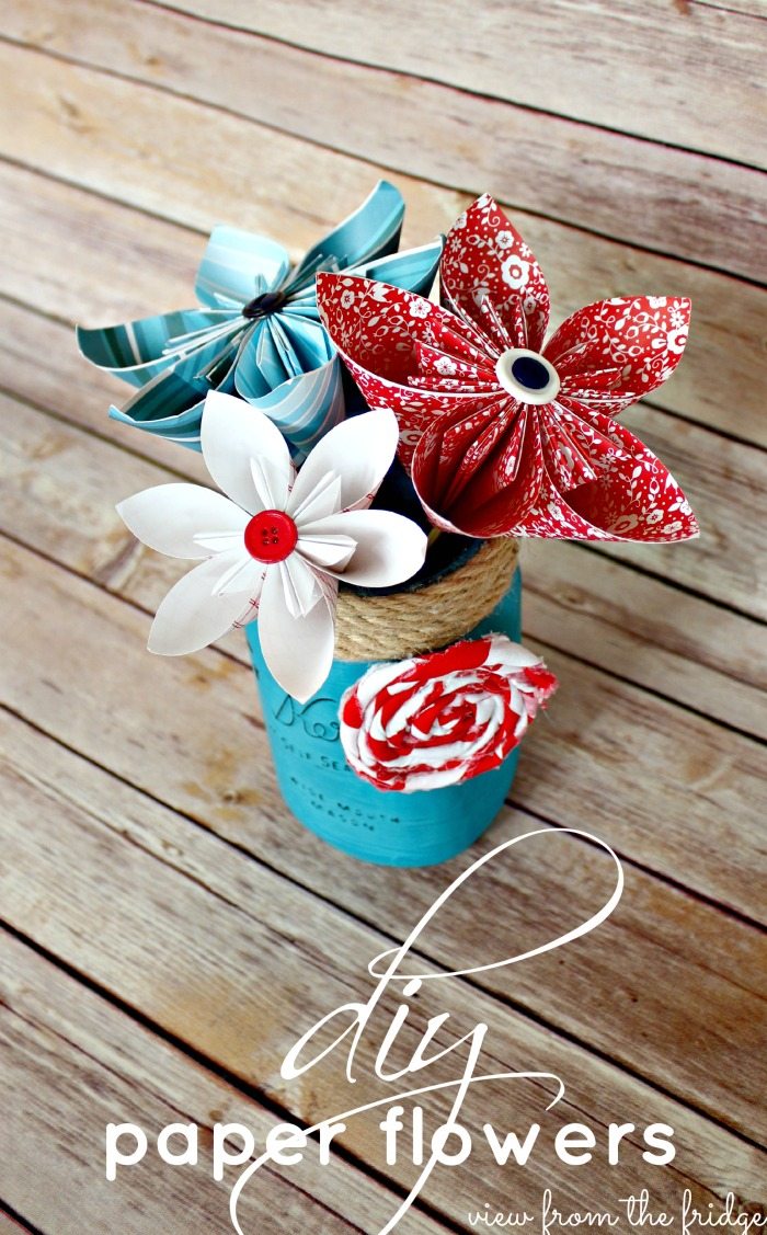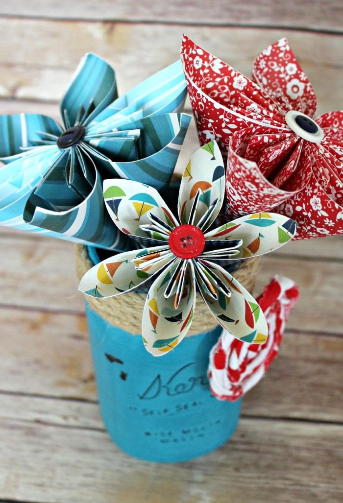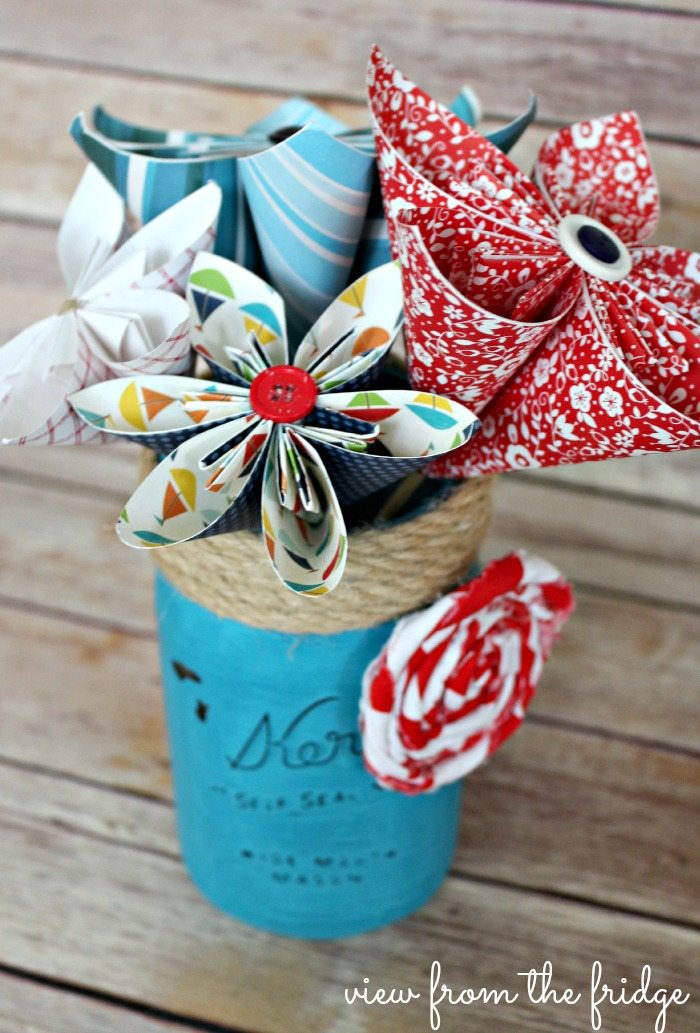Red, white and blue paper flowers made with patterned paper in a blue mason jar with jute cording around the top and a white and red rolled fabric rose.