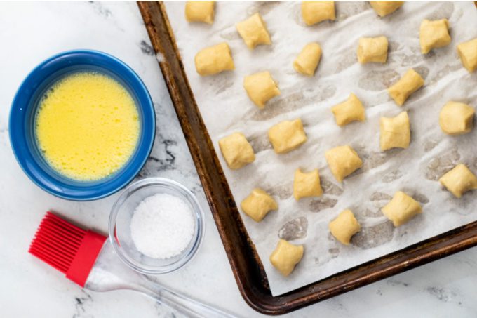 - Remove with a slotted spoon to the prepared baking sheet. Generously sprinkle sea salt over the dough.