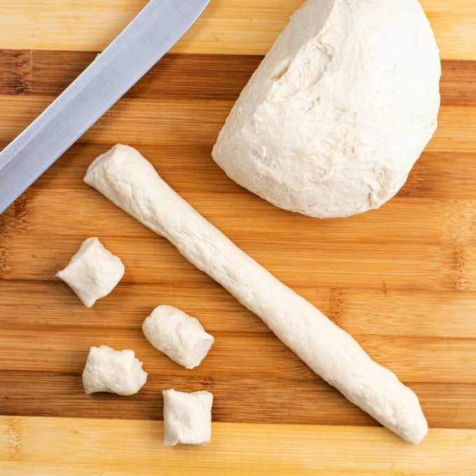 You can also use bread dough or pizza dough to make these easy homemade soft pretzel bites. Turn the ball of dough out onto a floured surface and roll it into a long rope. Then, use a bench scraper or pizza cutter to cut it into equal pieces - about 1 inch pieces.