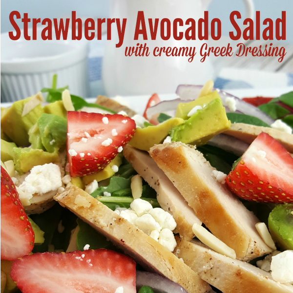 With lots of fresh strawberries, baby spinach, red onion, slivered almonds, feta cheese, and creamy avocado, this chicken salad truly is a complete meal.