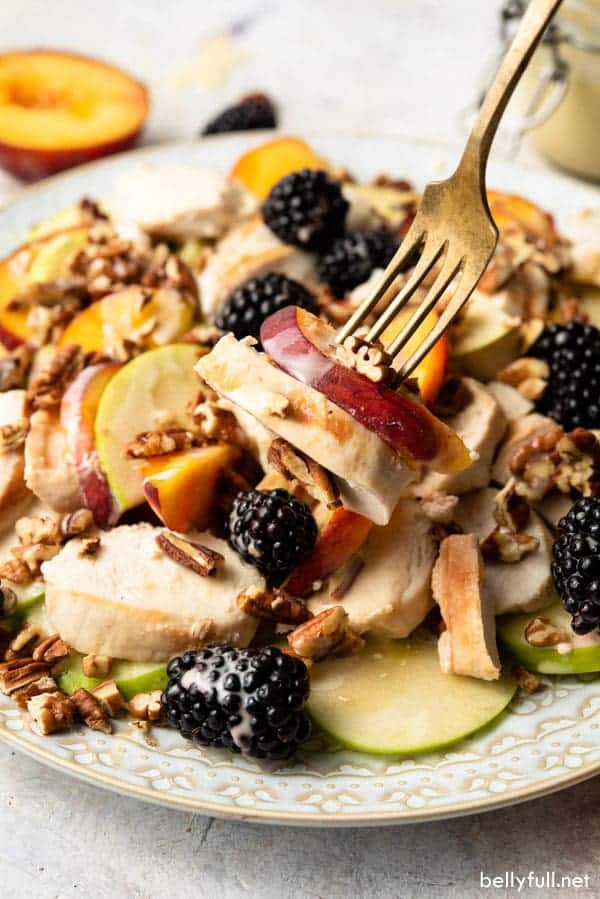 From Bellyfull - Everyone will love this light Honey Chicken Salad with fresh apples, peaches, blackberries, pecans, grilled chicken, and a fantastic dressing. With creamy dressing, this is perfect for lunch or light dinner.