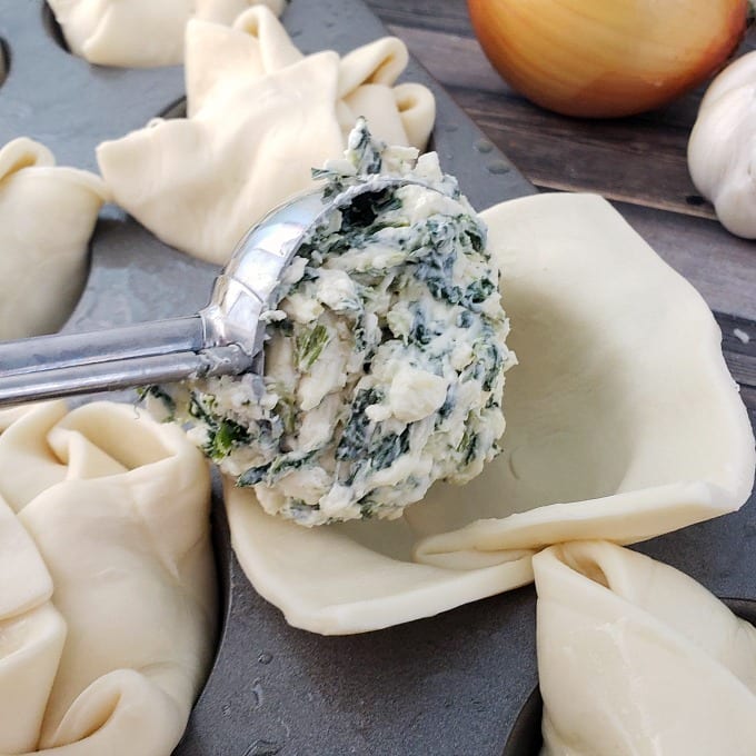 • Use a muffin scoop (see my favorite below) or tablespoon to evenly fill the dough cups with the spinach mixture.