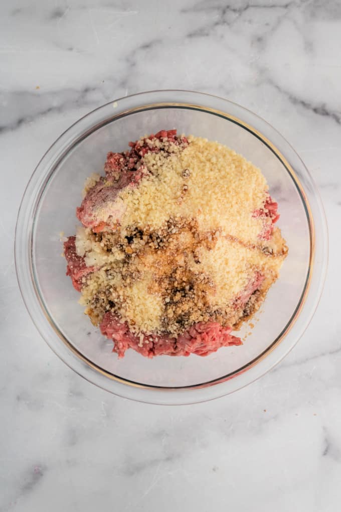 - Meanwhile, in a large bowl, blend together beef, Worcestershire sauce, grated cheese, breadcrumbs, onion, black pepper, and garlic. Do not over mix.1½ lb 80-90% lean ground beef, 3 tablespoons Worcestershire sauce, ¼ cup seasoned breadcrumbs, ¼ cup onion, 1½ teaspoon finely minced garlic, 4 ounces sharp Parmesan cheese, freshly ground black pepper