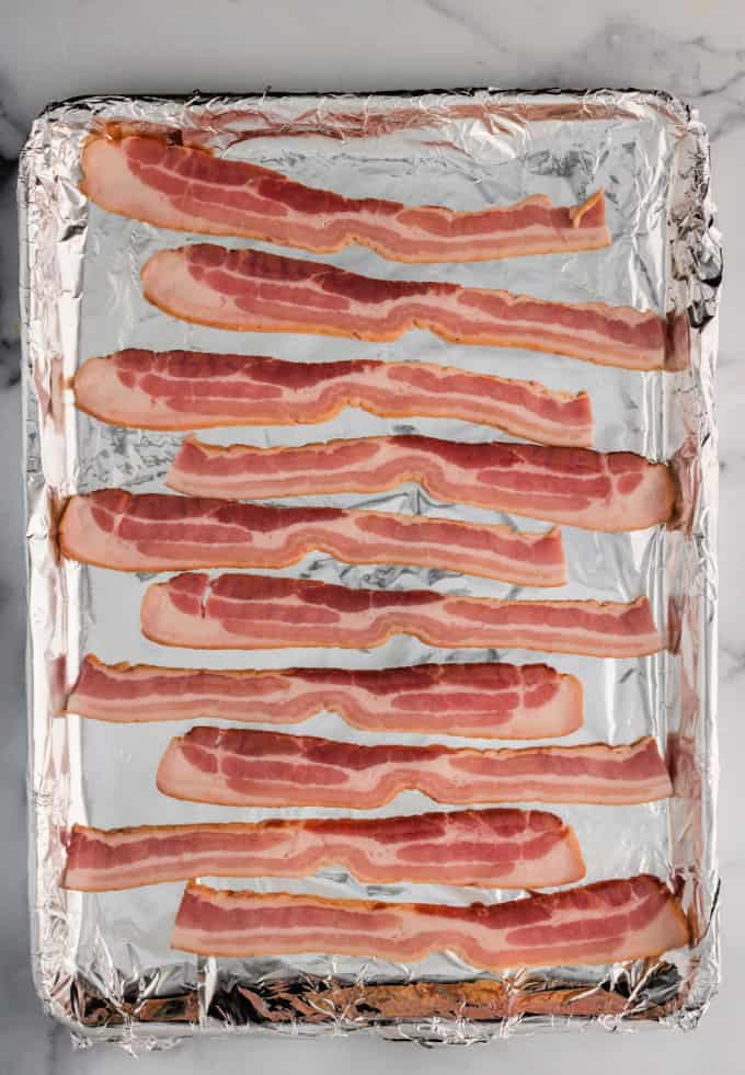 - Arrange the bacon on the baking sheet.12 slices of bacon, cooked