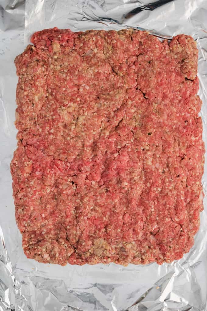 - Line a second baking sheet with aluminum foil. Add the beef mixture to the tray and press it down until it's about ¼ inch thick all the way around in an even layer.