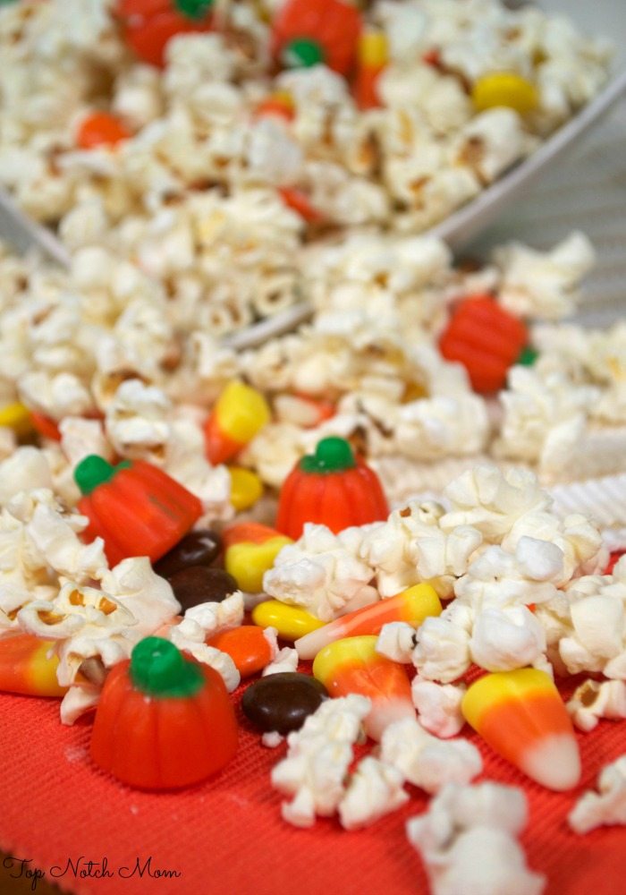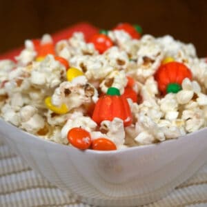 This fun Halloween popcorn snack is great for Halloween parties, but also other Fall gatherings like game day get togethers and Thanksgiving, too! Set it out in a big bowl, or place individual portions into small bags.
