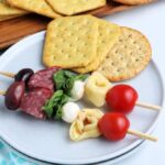 Starting with a cherry tomato, thread the antipasto kabobs.