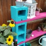 Place two of the tall cinder blocks for the base, and then set one of the shelves on top, lining up the corners.