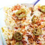 Stir in the garlic powder, the chopped jalapenos and most of the bacon, reserving some for garnish.