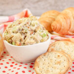 Our Rotisserie Chicken Salad recipe starts with grocery store rotisserie chicken and a creamy dressing that is great for everything from a bridal shower to lunchtime meal prep!